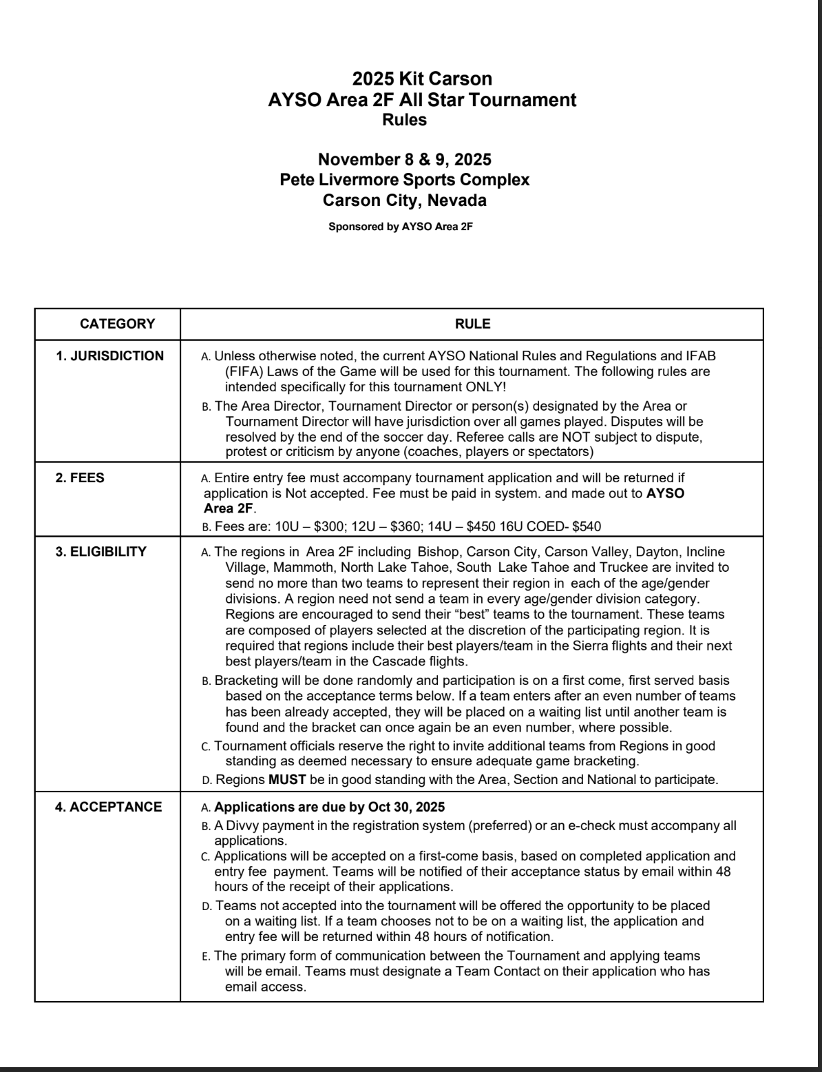 2025 Kit Carson Tournament AYSO Area 2F AllStar TournamentNov 8th and 9thPete Livermore Sports Complex Carson City, Nevada